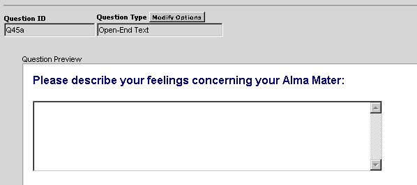 In the following example, a parent question asks for a text response using an Open-End Text question. Next, a Formula question is created to determine whether the words 'like,' 'good,' or 'great' (lower case only) appear in the response to the parent question. If so, the Boolean Question evaluates to true. Finally, a follow-up question is created and is displayed based on whether the respondent entered the selected words in response to the parent question.