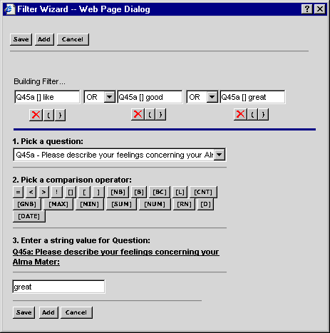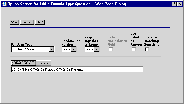 A Boolean formula generates either a 1 or a 0 value. If the filter statement evaluates to True, the value of this question is 1. If the filter statement evaluates to False, then the value is 0.
