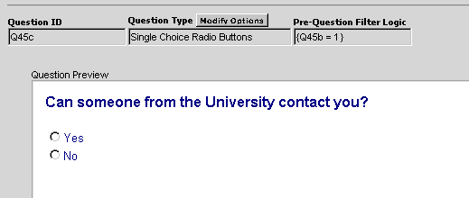 The example below is a single choice radio button question asking for a yes or no response. This question contains a pre-question filter and is only displayed if the respondent entered the words 'like,' 'good,' or 'great' in the parent question above.
