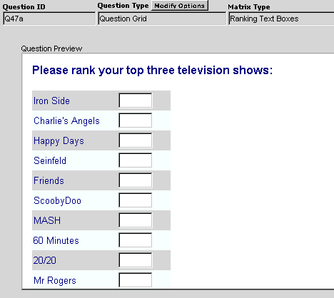 In the following example, a grid question lists ten TV shows and asks respondents to rank their top three favorites. Also displayed is an option that reads "I do not watch television." Since a grid question would not allow for a single response question (such as a radio button or check box that reads "I don't watch Television"), you would need to create two questions and merge them to a single page. The first question is the "Ranking Grid" question, and the second question is a multiple selection check box labeled, "I don't watch television."