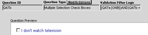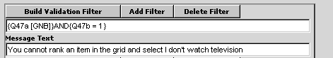 Normally, the answers to one question on a page are not validated against the answers to another question on the page. Using the Validation Filters, you could set up a series of rules that would alert the respondent that there is an error if they had answered the "Ranking Grid" question and answered "I don't watch TV".