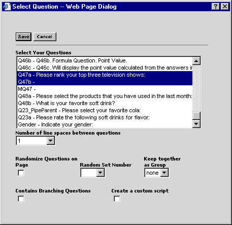 In this example, a ranking question is created. Next, a row question is created that contains validation filters. Finally, the two questions are merged onto the same page.